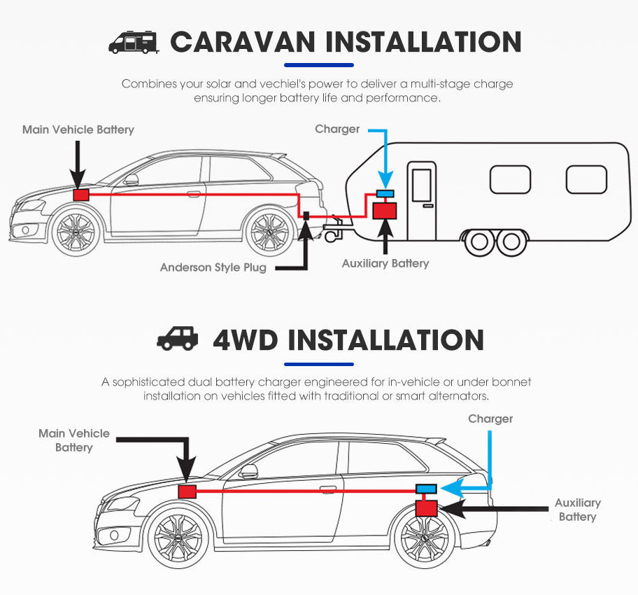 - Dual Input: To efficiently charge your auxiliary battery, this 12V 40A DC to DC Battery Charger can draw power from solar panels (up to 40A) or the alternator of your car.